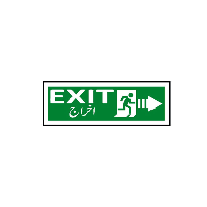 An Exit Sign ( right arrow ) has safety messages for emergency response protocol and compliance, this sign also glows at night. An Exit Sign is a helpful resource to help protect the health and safety of personnel, and is not a substitute for required protective measures for reducing or eliminating hazards.